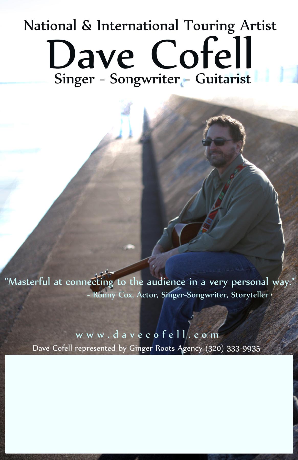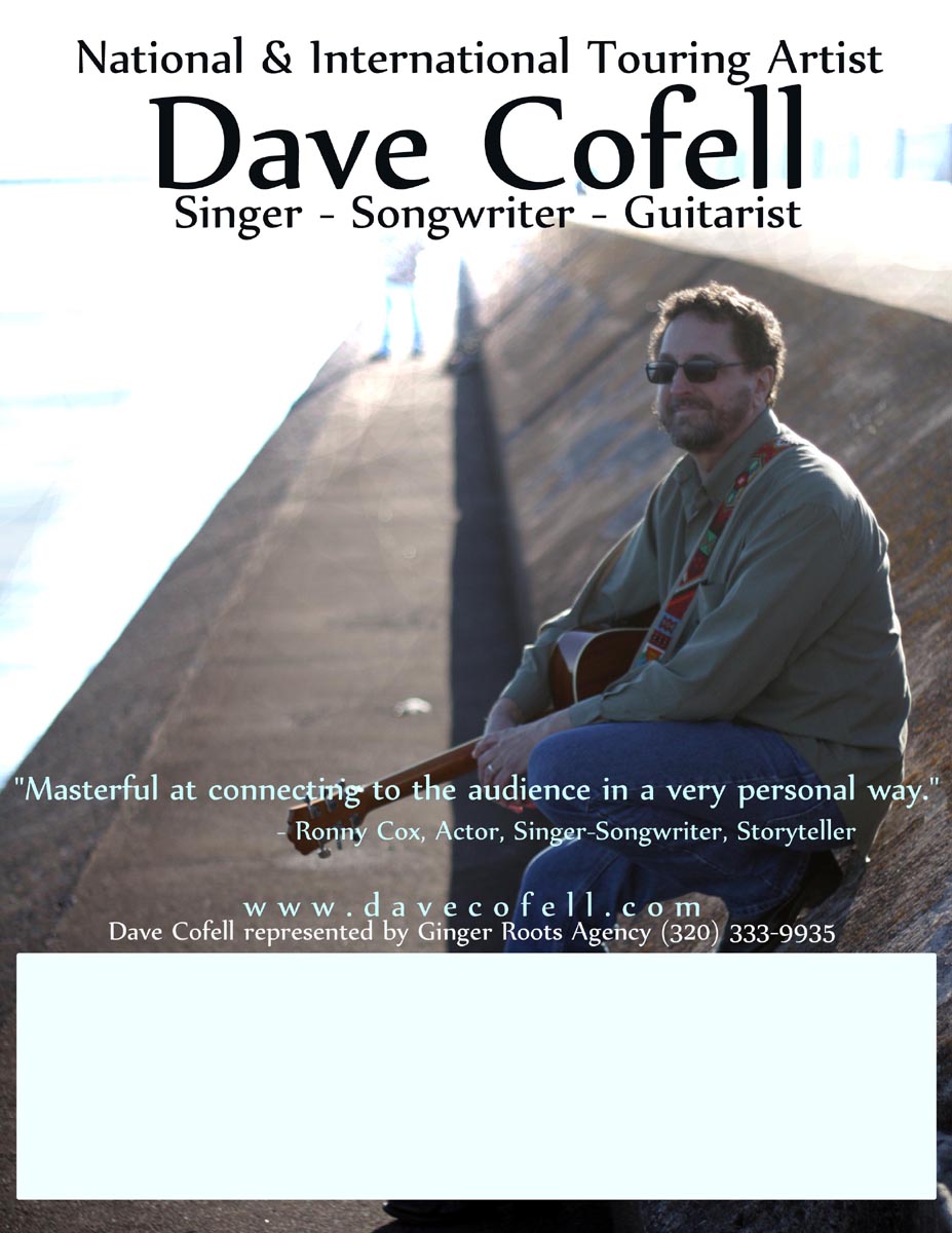 Press"Masterful at connecting to the audience in a very personal way. Simplicity is always the key to engaging an audience... and Dave does it as good or better than anyone."- Ronny Cox, Actor, Singer-Songwriter, Storyteller Dave's song, 'The Billionaires', is "The true spirit of Folk Music." - Joel McColl, Folk Musician "Dave Cofell is quite an accomplished troubadour, his original songs are diverse." - Leslie Black and Carl Zoretich - cohosts of The Beat Farm, KTWH 99.5 FM Two Harbors Community Radio "Dave Cofell gets an A for Authenticity. His songs are insightful and clever, delivered with his rich, baritone voice and nimble fingerstyle guitar." - Carl Unbehaun, Minnesota HomeBrew Music Show, Pioneer 90.1 FM, Thief River Falls, MN "Wow. Dave just did on a twelve-string what most people can't do on a six-string. We are really looking forward to watching that energetic performance again on video, wow!" - Jennifer Cutting, Folklife Specialist, American Folklife Center, Library of Congress |